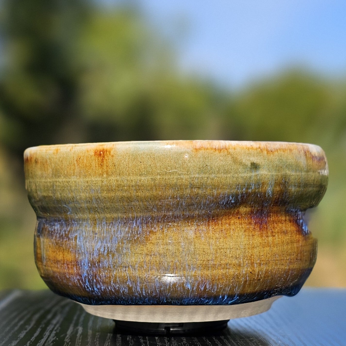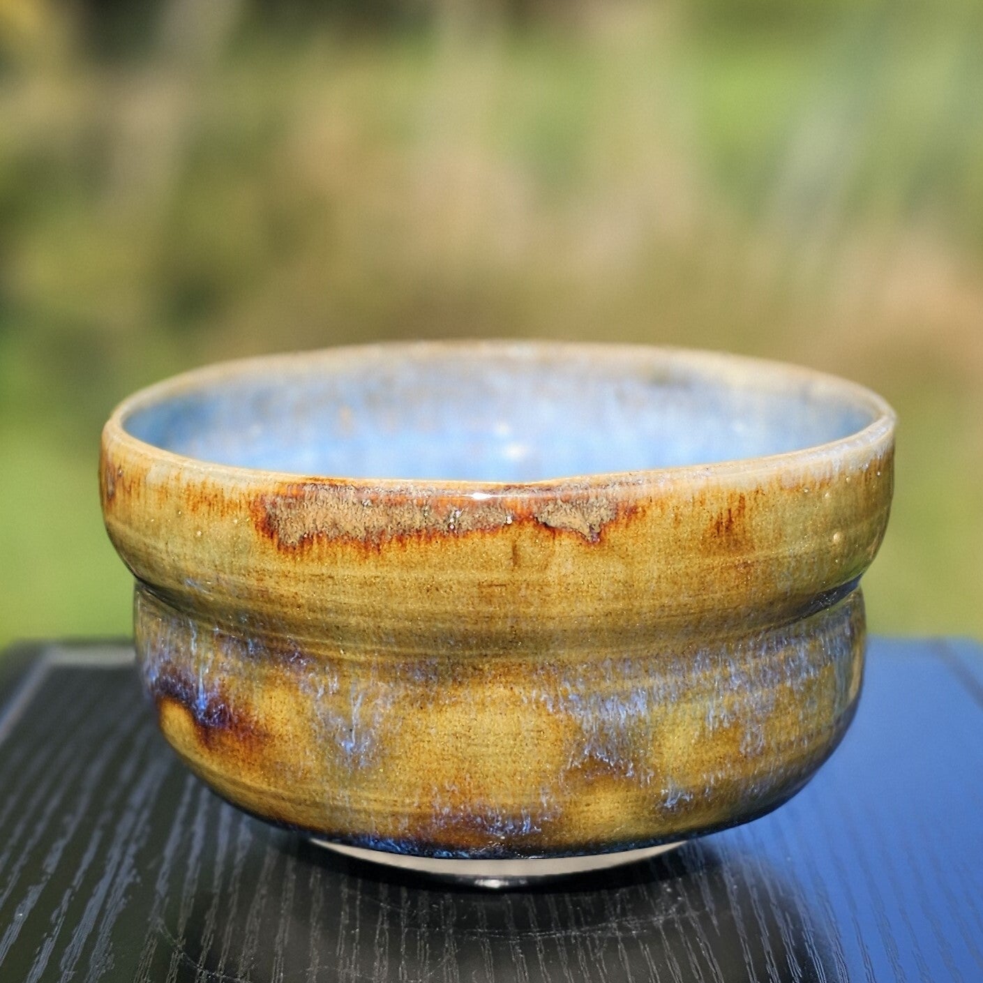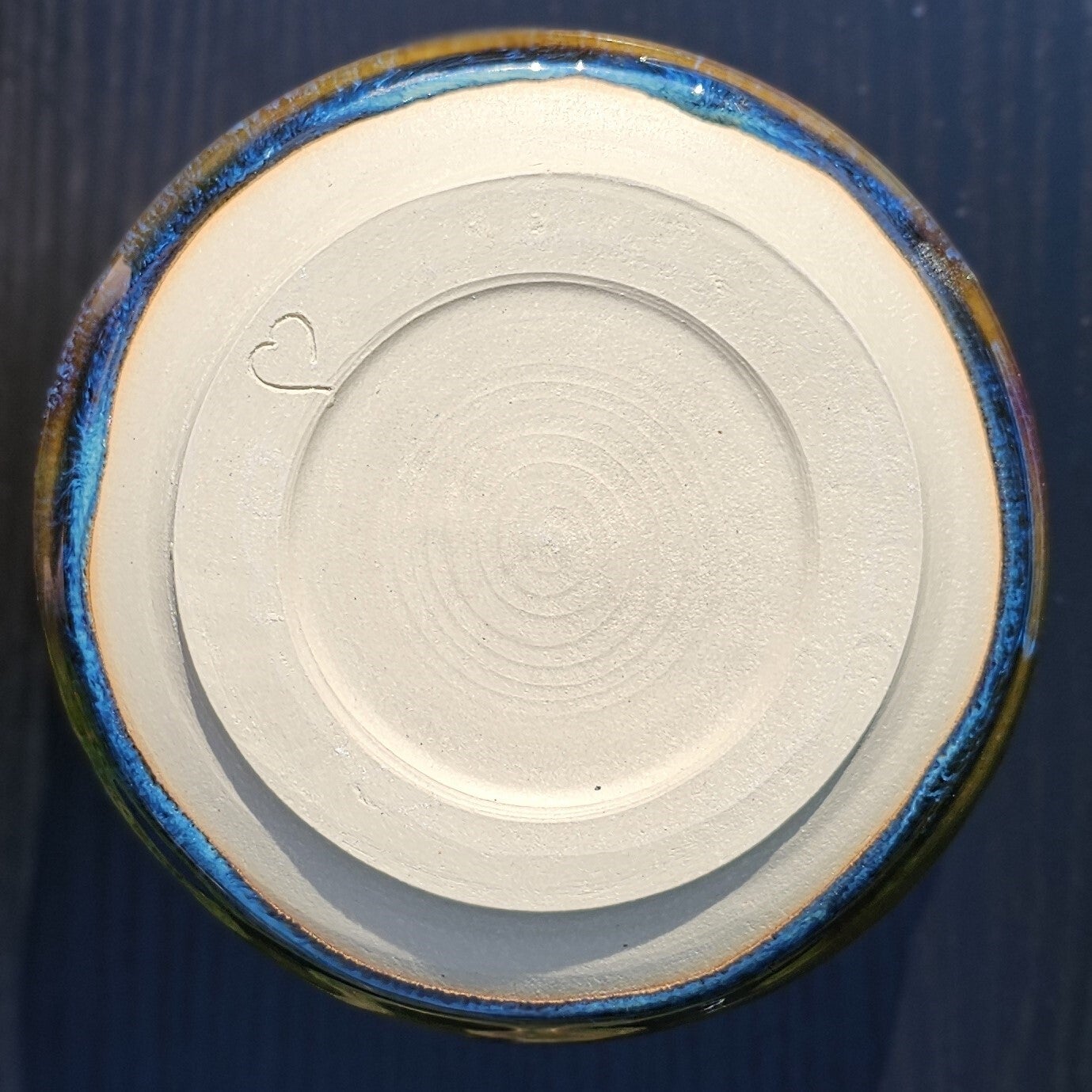 Het licht doorschijnende bruine glazuur op de buitenzijde geeft een rustiek en roestig effect en staat in contrast met het opake helderblauwe glazuur op de binnenzijde.