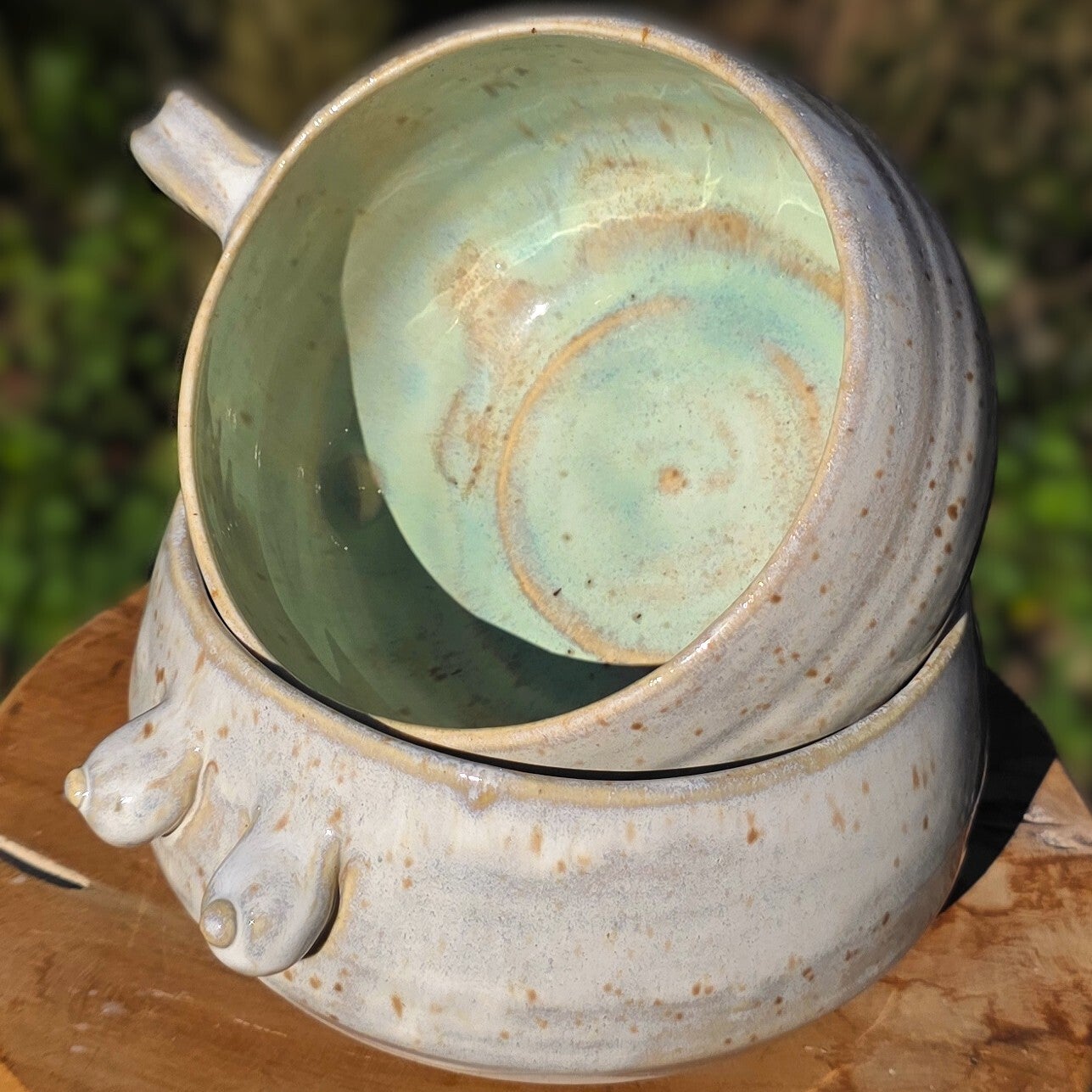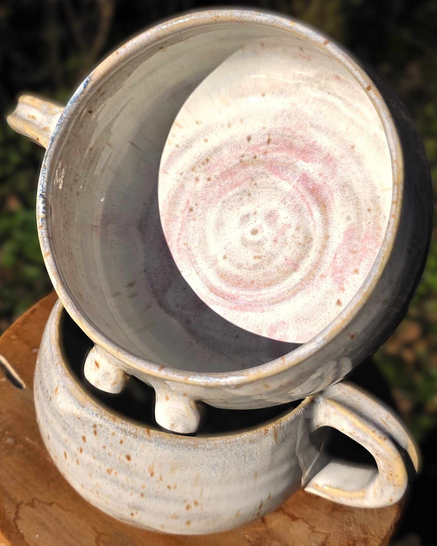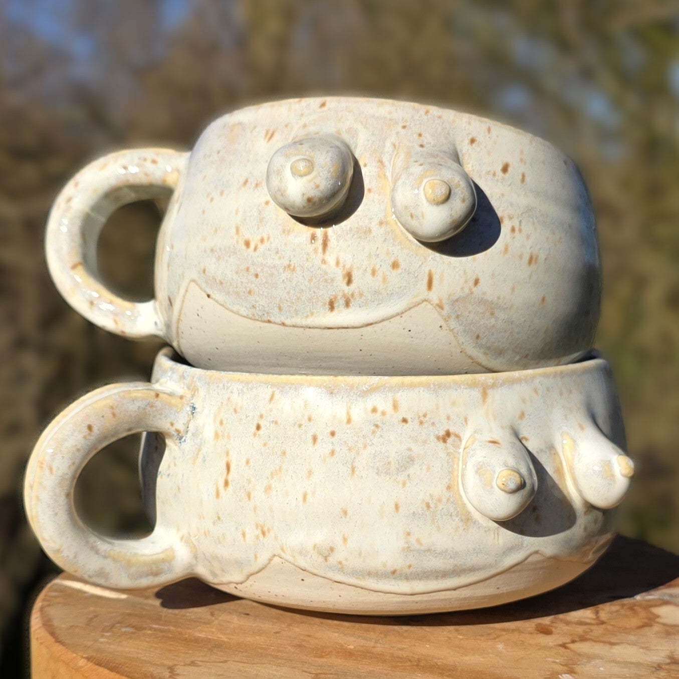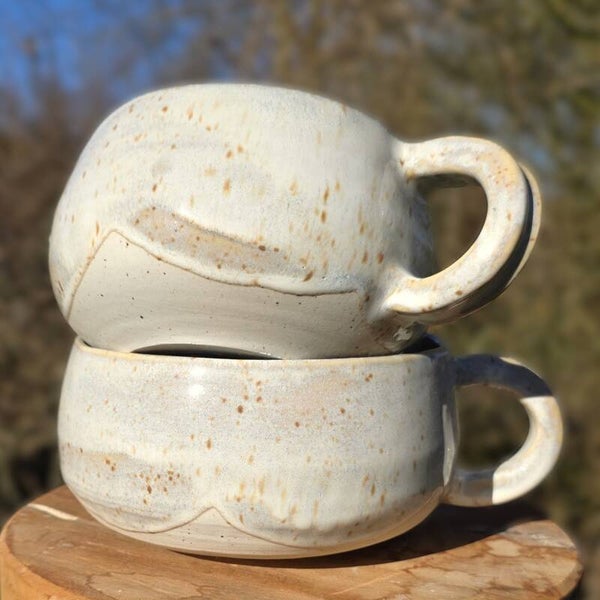 Handgedraaide mokken met oor en prachtige borsten. Of kommen, want zo groot zijn ze wel. Prima als theemok te gebruiken voor de grote drinker of als soepkom. Met het oor eraan kun je alle kanten op.