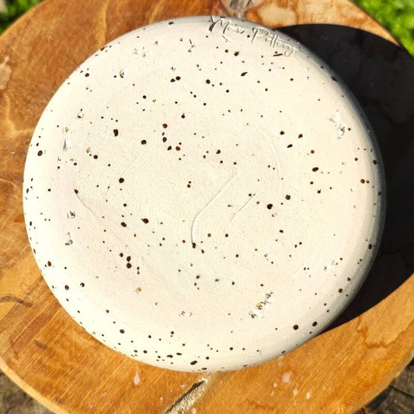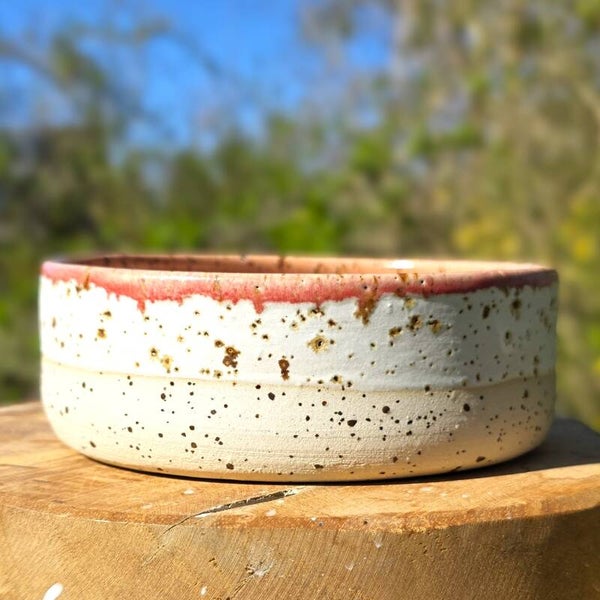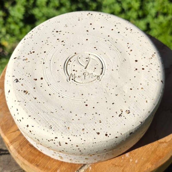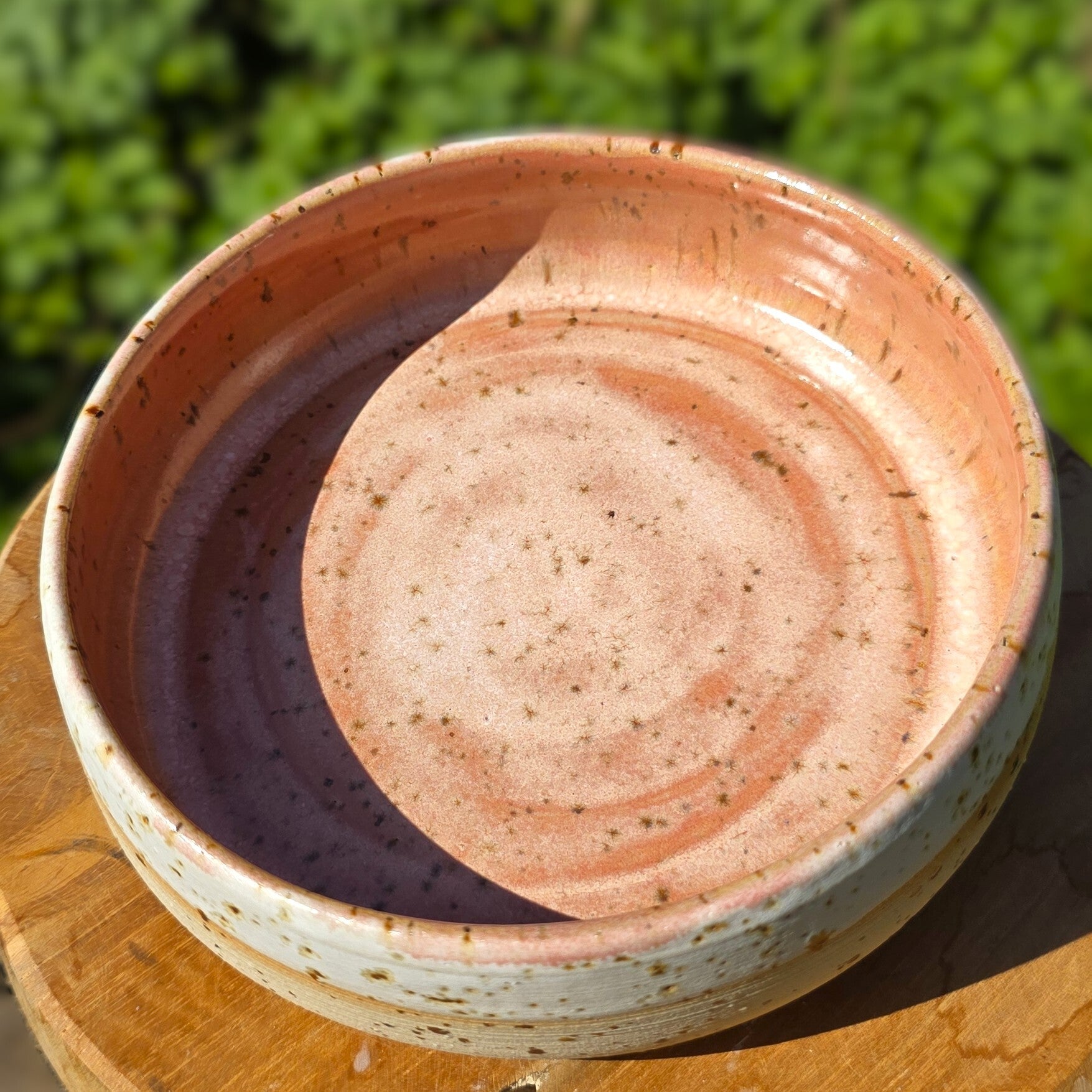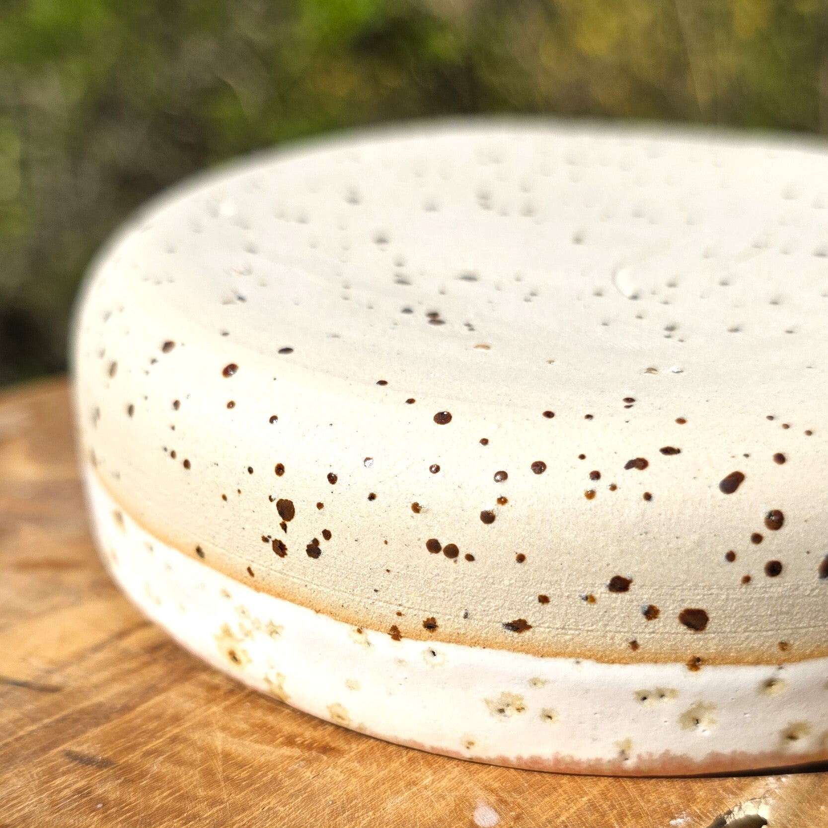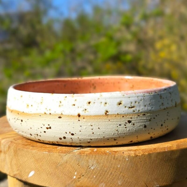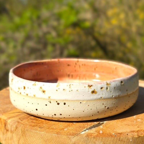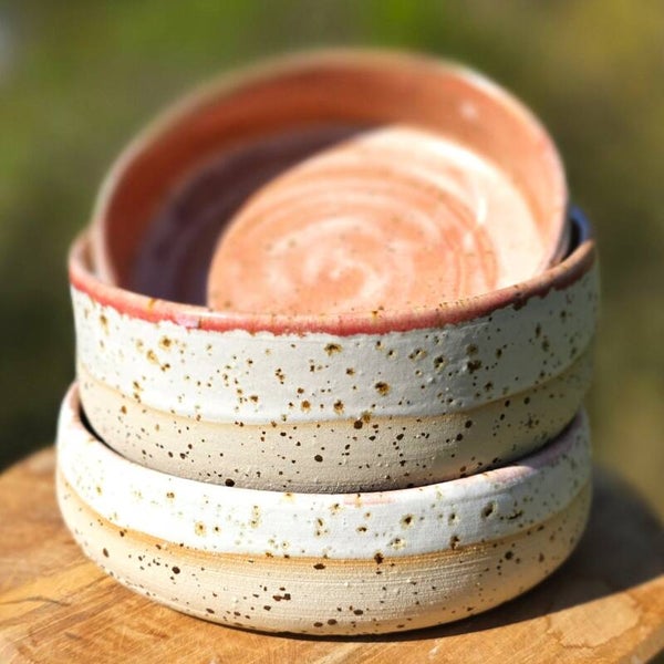 Handgedraaide schaaltjes in verschillende afmetingen. Aan de binnenkant en de buitenkant is een glazuur gebruikt met een satijnachtige glans en de spikkels van de klei laten de kleuren hun werk doen. De detailfoto's staan op volgorde van klein, hoog, laag.