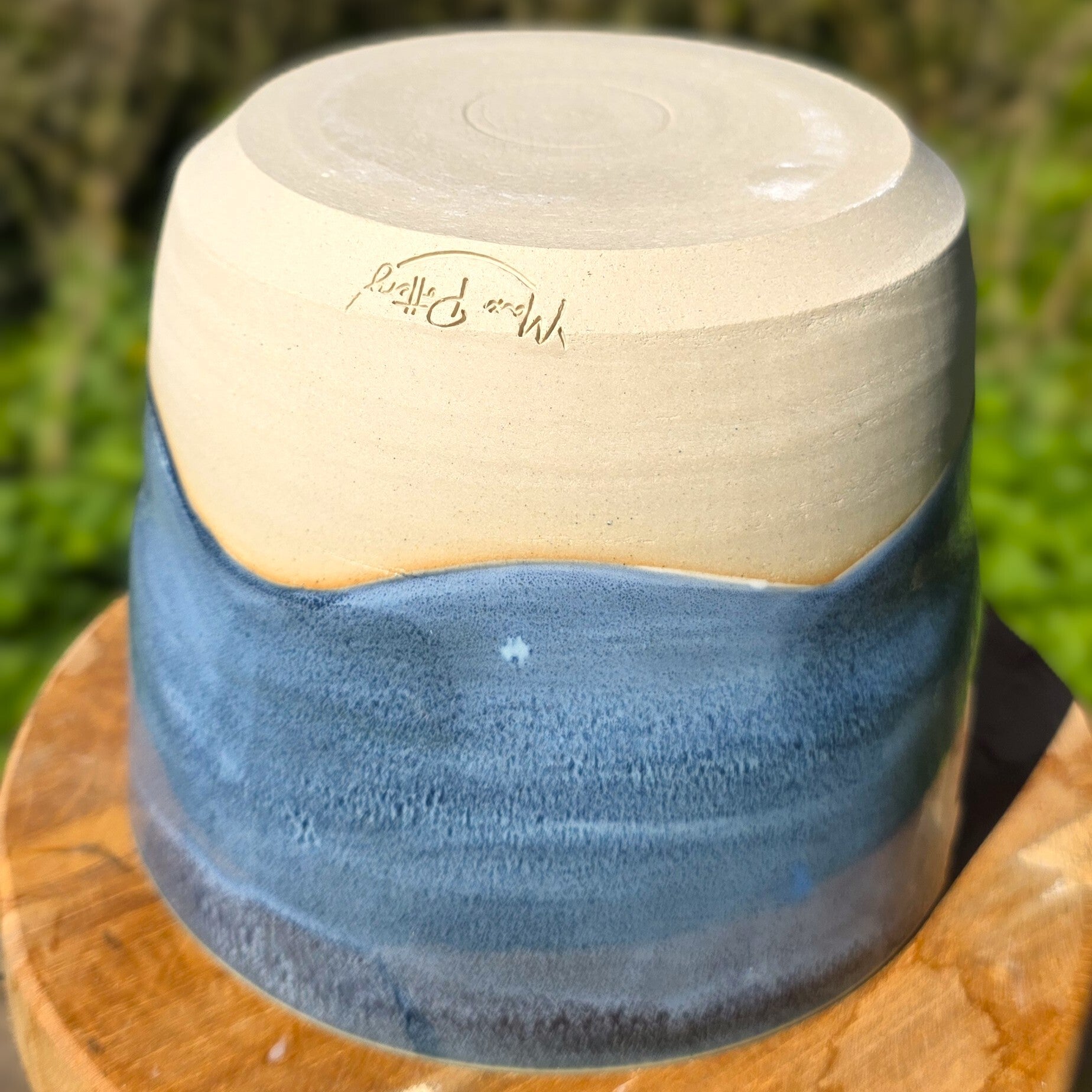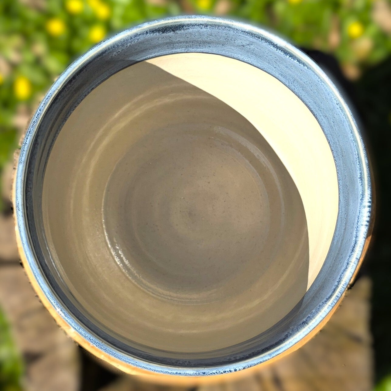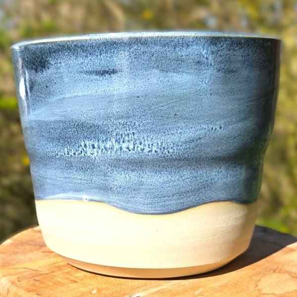 Handgedraaide plantenpot. Het glazuur aan de buitenkant een golvende afwerking voor een speels effect. De binnenkant is dezelfde kleur aan de bovenrand en is verder met blanke glazuur afgewerkt.
