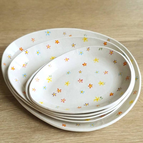 Handgevormde schalen in verschillende maten met vrolijke handgeschilderde bloemetjes in alle kleuren. Per stuk te bestellen, maar voor een set geldt een speciale prijs.