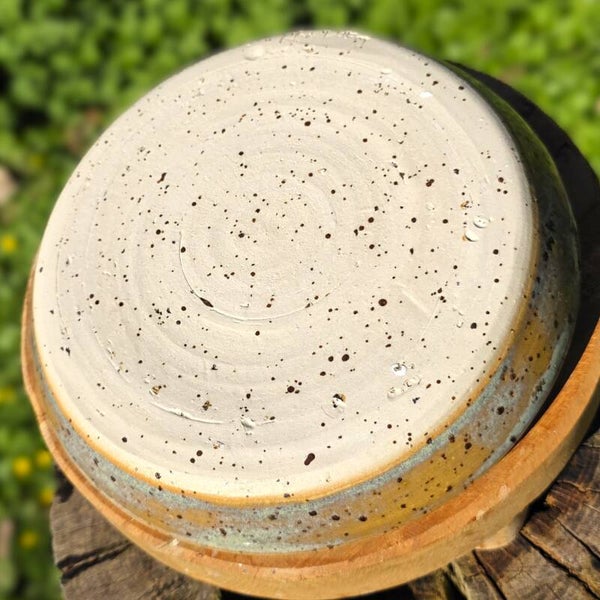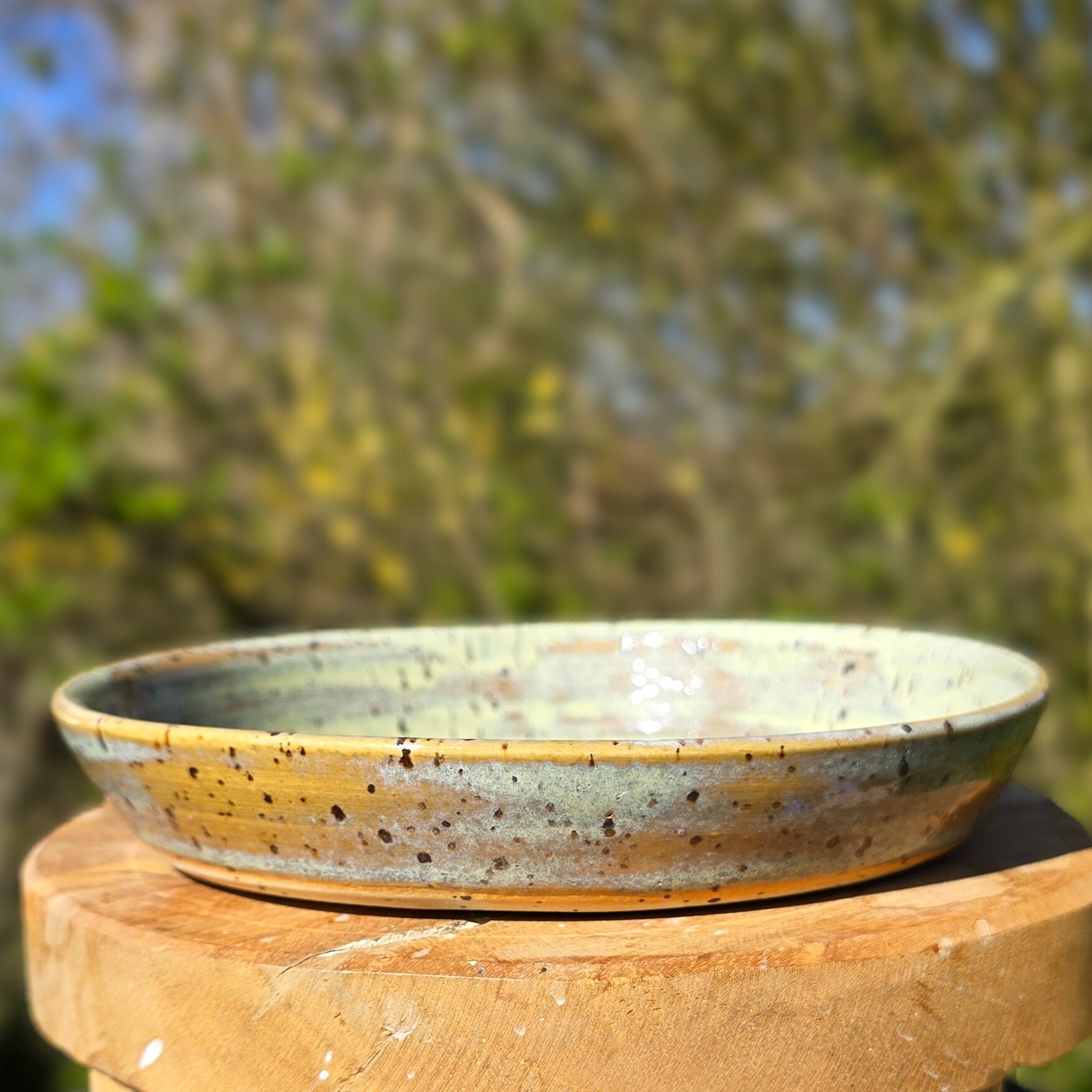 Handgedraaide platte kom. Het olijfgroene glazuur geeft een klassiek effect in combinatie met de gespikkelde klei.
