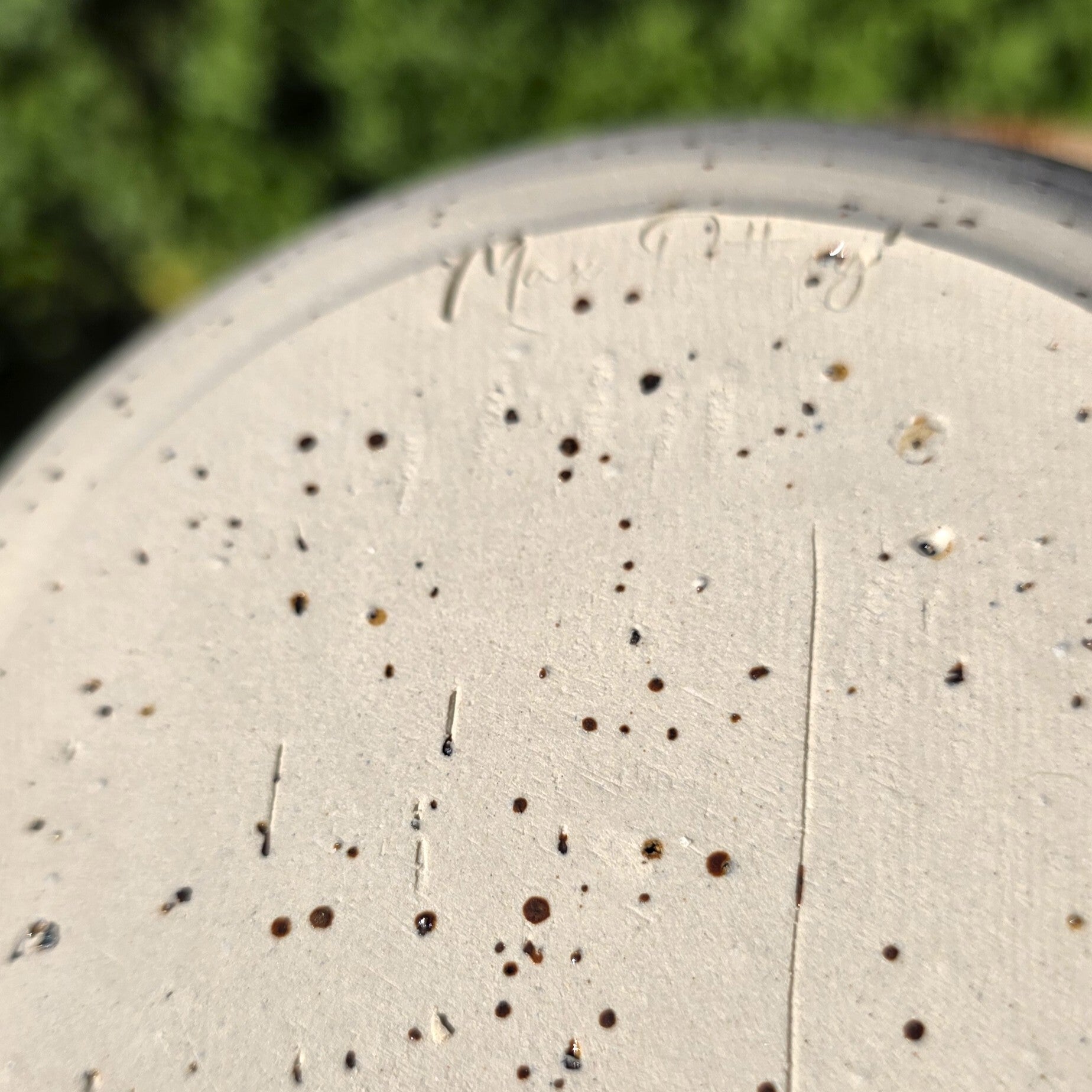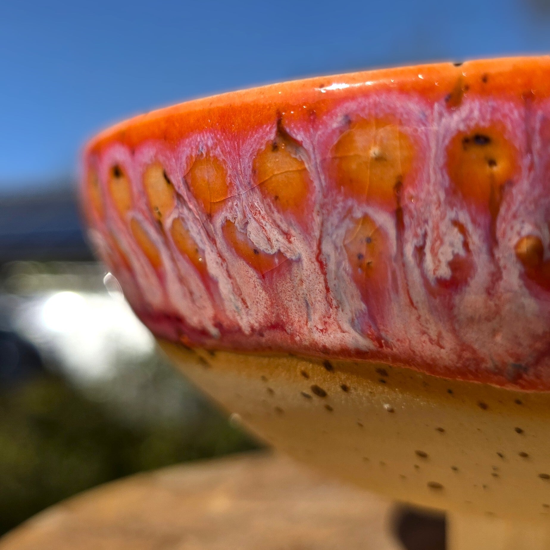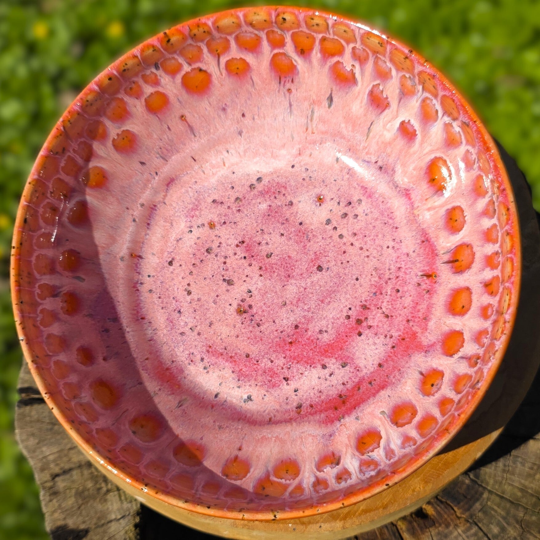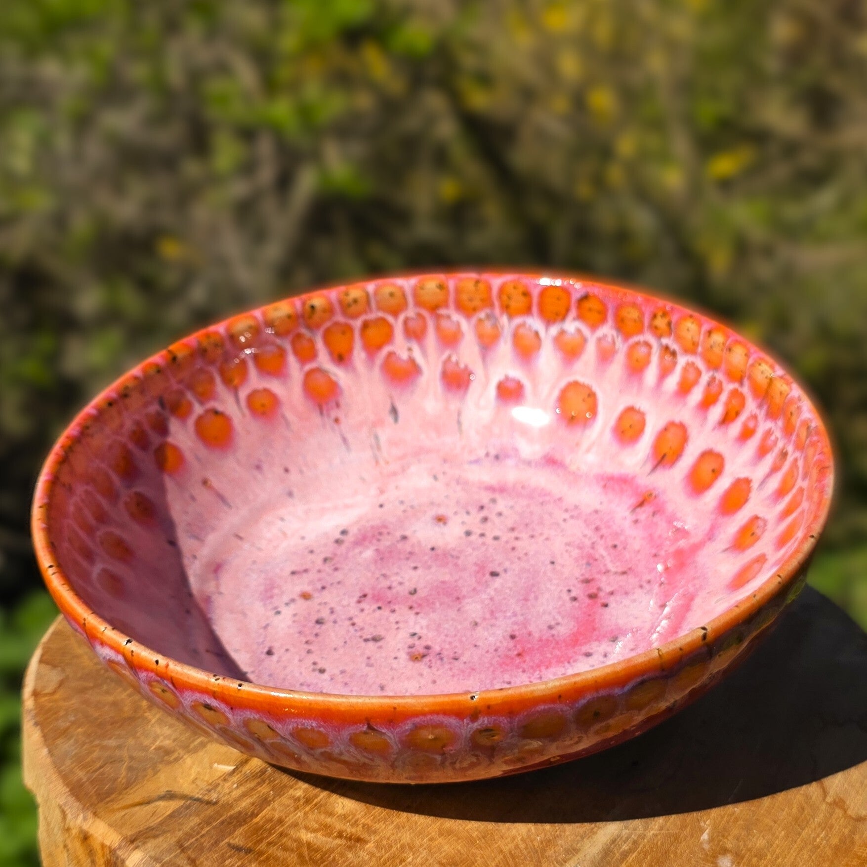 Handgedraaide platte schaal. Het fuchsia roze glazuur komt nog meer tot leven door de gespikkelde klei.